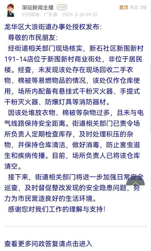 尊敬的市民朋友:经街道相关部门现场核实,新石社区新围新村191-14店位于新围新村商业街处,非位于居民楼。经查,未发现该处存在现场回收二手衣物、棉被等易燃物品的情况,该处仅作仓库使用,场所内配备有悬挂式干粉灭火器、手提式干粉灭火器、防爆灯具等消防器材。因该处堆放衣物、棉被等杂物过多,且未与电气线路保持安全距离。街道相关部门已责令场所负责人定期检查库存,及时处理积压的杂物,并保持仓库清洁,做好消毒,防止害虫滋生和疾病传播。目前,场所负责人已将该仓库清空。接下来,街道相关部门将进一步加强日常安全巡查,及时督促整改发现的安全隐患问题,努力为市民营造良好的生活环境。感谢您对我们工作的理解与支持!