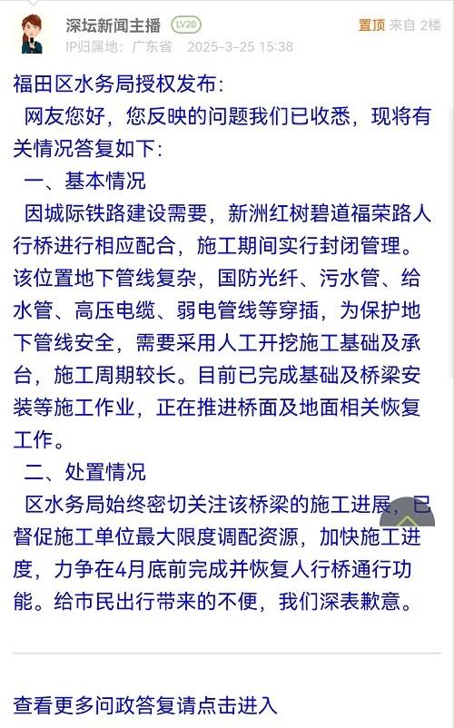 区水务局始终密切关注该桥梁的施工进展,已督促施工单位最大限度调配资源,加快施工进度,力争在4月底前完成并恢复人行桥通行功能。给市民出行带来的不便,我们深表歉意。