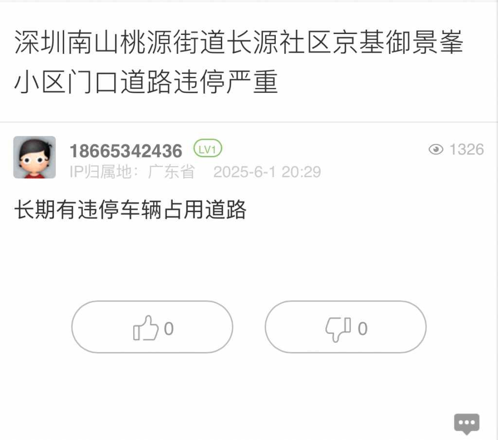 25. 帖文《深圳南山桃源街道长源社区京基御景峯小区门口道路违停严重》