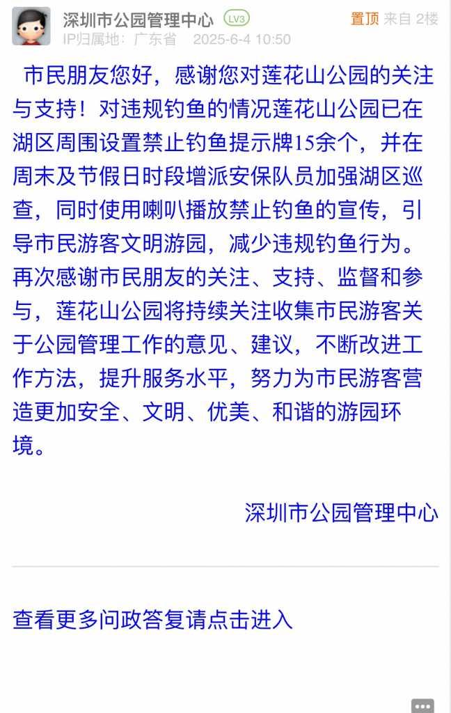 市民朋友您好,感谢您对莲花山公园的关注与支持!对违规钓鱼的情况莲花山公园已在湖区周围设置禁止钓鱼提示牌15余个,并在周末及节假日时段增派安保队员加强湖区巡查,同时使用喇叭播放禁止钓鱼的宣传,引导市民游客文明游园,减少违规钓鱼行为。再次感谢市民朋友的关注、支持、监督和参与,莲花山公园将持续关注收集市民游客关于公园管理工作的意见、建议,不断改进工作方法,提升服务水平,努力为市民游客营造更加安全、文明、优美、和谐的游园环境。