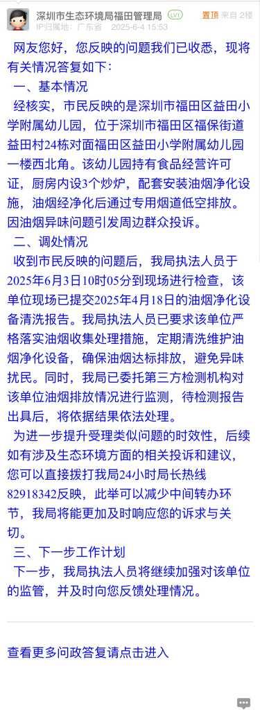 经核实,市民反映的是深圳市福田区益田小学附属幼儿园,位于深圳市福田区福保街道益田村24栋对面福田区益田小学附属幼儿园一楼西北角。该幼儿园持有食品经营许可证,厨房内设3个炒炉,配套安装油烟净化设施,油烟经净化后通过专用烟道低空排放。因油烟异味问题引发周边群众投诉。