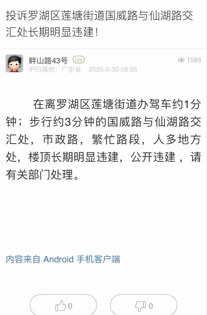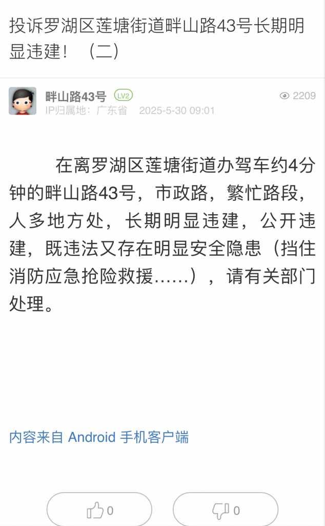 19. 帖文《投诉罗湖区莲塘街道畔山路43号长期明显违建!(二)》