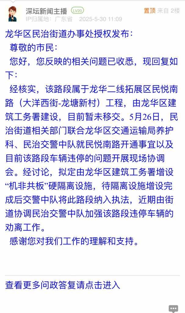 经核实,该路段属于龙华二线拓展区民悦南路(大洋西街-龙塘新村)工程,由龙华区建筑工务署建设,目前暂未移交。5月26日,民治街道相关部门联合龙华区交通运输局养护科、民治交警中队就民悦南路开通事宜以及目前该路段车辆违停的问题开展现场协调会。经讨论,拟定由龙华区建筑工务署增设“机非共板”硬隔离设施,待隔离设施增设完成后交警中队将此路段纳入执法,近期由街道协调民治交警中队加强该路段违停车辆的劝离工作。