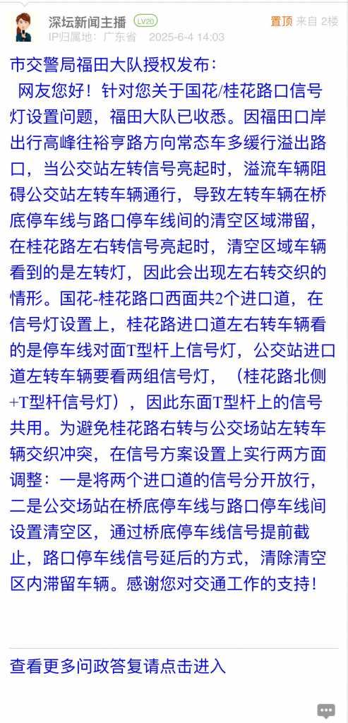 网友您好!针对您关于国花/桂花路口信号灯设置问题,福田大队已收悉。因福田口岸出行高峰往裕亨路方向常态车多缓行溢出路口,当公交站左转信号亮起时,溢流车辆阻碍公交站左转车辆通行,导致左转车辆在桥底停车线与路口停车线间的清空区域滞留,在桂花路左右转信号亮起时,清空区域车辆看到的是左转灯,因此会出现左右转交织的情形。国花-桂花路口西面共2个进口道,在信号灯设置上,桂花路进口道左右转车辆看的是停车线对面T型杆上信号灯,公交站进口道左转车辆要看两组信号灯,(桂花路北侧+T型杆信号灯),因此东面T型杆上的信号共用。为避免桂花路右转与公交场站左转车辆交织冲突,在信号方案设置上实行两方面调整:一是将两个进口道的信号分开放行,二是公交场站在桥底停车线与路口停车线间设置清空区,通过桥底停车线信号提前截止,路口停车线信号延后的方式,清除清空区内滞留车辆。感谢您对交通工作的支持!