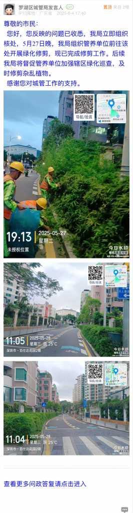 您好,您反映的问题已收悉,我局立即组织核处,5月27日晚,我局组织管养单位前往该处开展绿化修剪,现已完成修剪工作。后续我局将督促管养单位加强辖区绿化巡查,及时修剪杂乱植物。