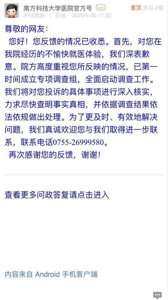您好!您反馈的情况已收悉。首先,对您在我院经历的不愉快就医体验,我们深表歉意。院方高度重视您所反映的情况,已第一时间成立专项调查组,全面启动调查工作。我们将对您投诉的具体事项进行深入核实,力求尽快查明事实真相,并依据调查结果依法依规做出处理。为了更及时、有效地解决问题,我们真诚欢迎您与我们取得进一步联系,联系电话0755-26999580。