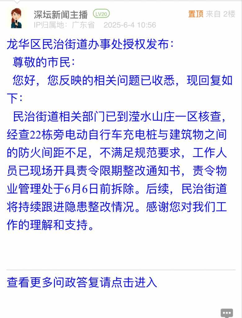 民治街道相关部门已到滢水山庄一区核查,经查22栋旁电动自行车充电桩与建筑物之间的防火间距不足,不满足规范要求,工作人员已现场开具责令限期整改通知书,责令物业管理处于6月6日前拆除。后续,民治街道将持续跟进隐患整改情况。感谢您对我们工作的理解和支持。