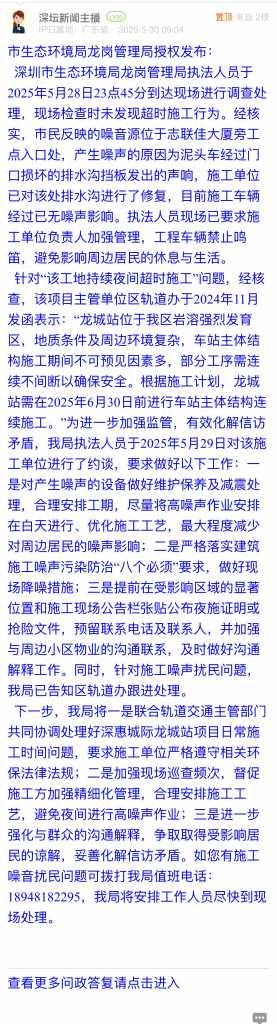 针对“该工地持续夜间超时施工”问题,经核查,该项目主管单位区轨道办于2024年11月发函表示:“龙城站位于我区岩溶强烈发育区,地质条件及周边环境复杂,车站主体结构施工期间不可预见因素多,部分工序需连续不间断以确保安全。根据施工计划,龙城站需在2025年6月30日前进行车站主体结构连续施工。”为进一步加强监管,有效化解信访矛盾,我局执法人员于2025年5月29日对该施工单位进行了约谈,要求做好以下工作:一是对产生噪声的设备做好维护保养及减震处理,合理安排工期,尽量将高噪声作业安排在白天进行、优化施工工艺,最大程度减少对周边居民的噪声影响;二是严格落实建筑施工噪声污染防治“八个必须”要求,做好现场降噪措施;三是提前在受影响区域的显著位置和施工现场公告栏张贴公布夜施证明或抢险文件,预留联系电话及联系人,并加强与周边小区物业的沟通联系,及时做好沟通解释工作。同时,针对施工噪声扰民问题,我局已告知区轨道办跟进处理。