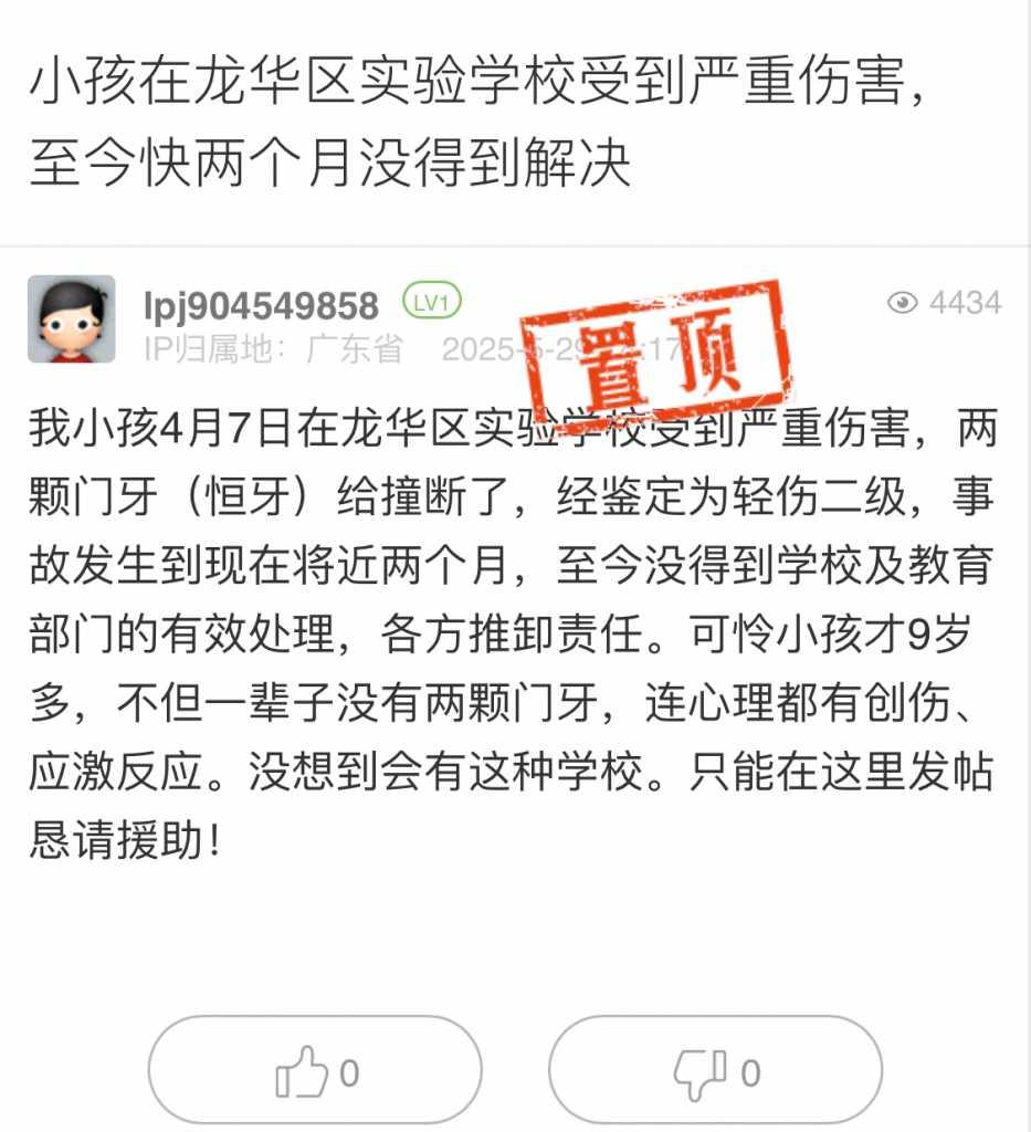17. 帖文《小孩在龙华区实验学校受到严重伤害,至今快两个月没得到解决》