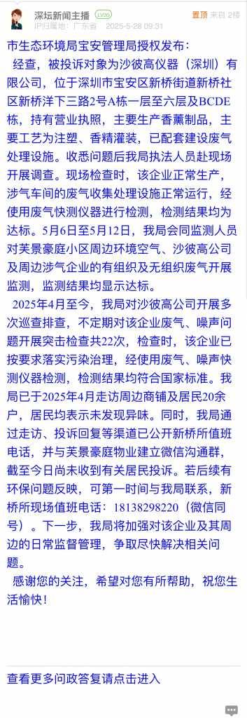 经查,被投诉对象为沙彼高仪器(深圳)有限公司,位于深圳市宝安区新桥街道新桥社区新桥洋下三路2号A栋一层至六层及BCDE栋,持有营业执照,主要生产香薰制品,主要工艺为注塑、香精灌装,已配套建设废气处理设施。收悉问题后我局执法人员赴现场开展调查。现场检查时,该企业正常生产,涉气车间的废气收集处理设施正常运行,经使用废气快测仪器进行检测,检测结果均为达标。5月6日至5月12日,我局会同监测人员对芙景豪庭小区周边环境空气、沙彼高公司及周边涉气企业的有组织及无组织废气开展监测,监测结果均显示达标。