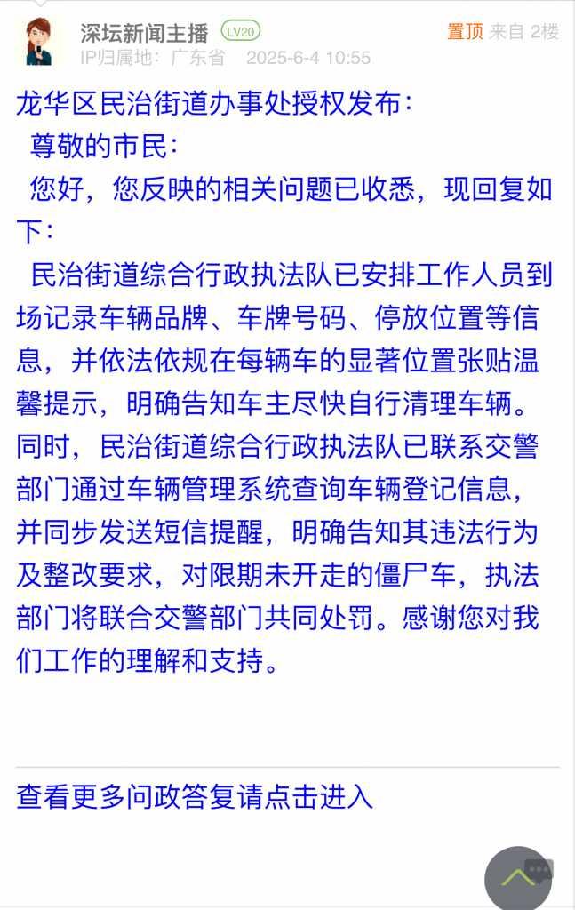 民治街道综合行政执法队已安排工作人员到场记录车辆品牌、车牌号码、停放位置等信息,并依法依规在每辆车的显著位置张贴温馨提示,明确告知车主尽快自行清理车辆。同时,民治街道综合行政执法队已联系交警部门通过车辆管理系统查询车辆登记信息,并同步发送短信提醒,明确告知其违法行为及整改要求,对限期未开走的僵尸车,执法部门将联合交警部门共同处罚。感谢您对我们工作的理解和支持。